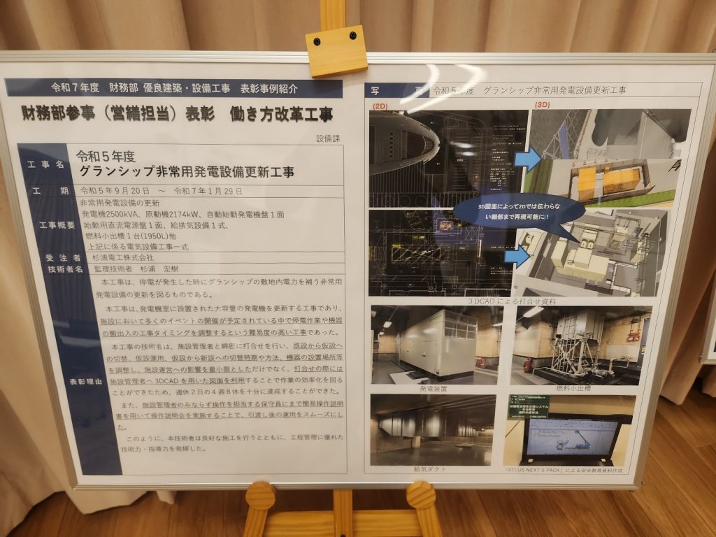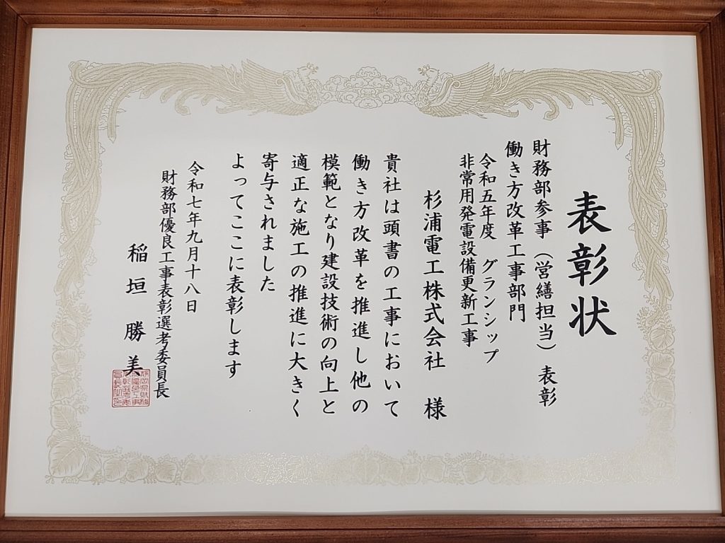 このたび9月18日㈭に行われました令和7年度 静岡県財務部優良建築・設備工事表彰式で当社が施工いたしましたグランシップ非常用発電設備更新工事が優良工事として優良工事表彰を受賞いたしました。